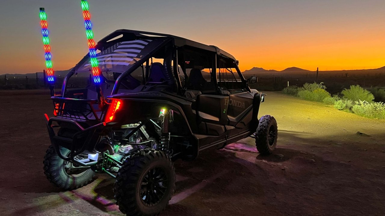 - Color & Uplighting (Free): Add color uplighting and LED accent lighting to your UTV for an unforgettable desert vibe — especially during sunset and evening tours. This upgrade includes whip lights and rock lights that bring the vehicle to life with vibrant colors while highlighting the terrain around you. The whip lights create a striking glow visible across the desert trails, while the rock lights illuminate the ground beneath the vehicle for a dramatic effect as you ride through canyons and open desert landscapes. It’s the perfect way to elevate your adventure and create a fun, unique atmosphere as the sun sets over the Sonoran Desert.